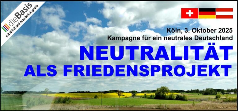 Am 03. Oktober 2025 fand im Kölner Hinterhofsalon eine gemeinsame Vortagsreihe der Neutralitätsbewegungen aus Österreich, der Schweiz und Deutschland mit anschließender Podiumsdiskussion statt. Der Abend stand unter der Überschrift „Neutralität als Friedensprojekt„. Die Neutralität mit ihrem Grundsatz ‚Krieg ohne uns‘…